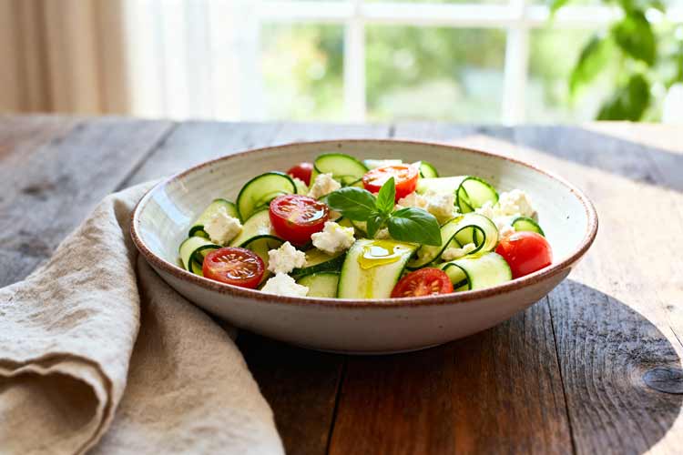 Courgettesalade met tomaatjes en feta maken, een gerecht dat eenvoudig oogt maar, mits goed bereid, vol zit met frisse smaken en een mooie balans tussen zachte en knapperige structuren. De courgette wordt rauw gebruikt en dun geschaafd, zodat de plakken een lichte bite behouden en tegelijk de smaken van de dressing goed opnemen. De tomaatjes geven zoetigheid en een lichte zuurgraad, terwijl de feta zorgt voor een ziltige tegenhanger. Door te werken met verse kruiden en een dressing op basis van extra vergine olijfolie, krijgt de salade een mediterrane touch die ideaal is op een warme dag of als bijgerecht bij gegrild vlees of vis.