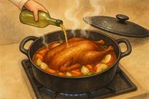 - Zet het vuur laag, plaats een deksel op de pan en laat de gans zachtjes sudderen voor 2 tot 3 uur. Bedruip af en toe met het braadvocht.