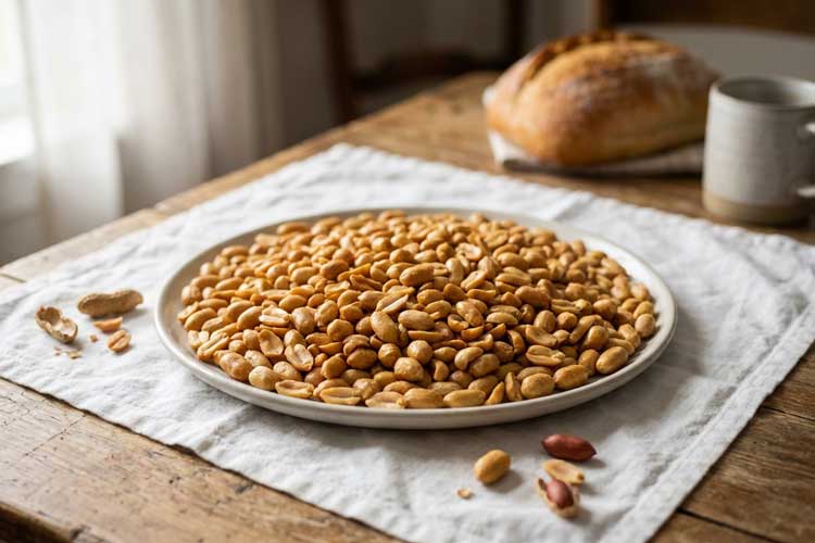 Zodra je een lichte nootachtige geur ruikt en de kleur net iets dieper wordt, haal je ze meteen uit de pan. Laat ze daarna afkoelen op een bord, niet in de hete pan, want daar garen ze nog door. Dit ene moment bepaalt of je pinda’s vol smaak zijn of net te ver zijn.