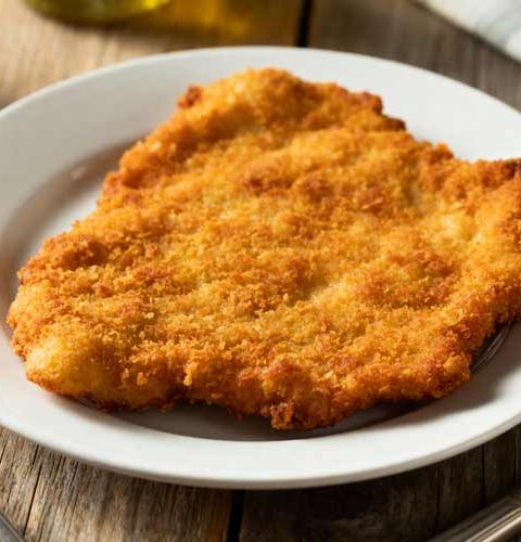 Verwarm de olie tot 175 graden en frituur de schnitzels 4 tot 5 minuten. Laat ze daarna uitlekken op keukenpapier voor een krokante korst.